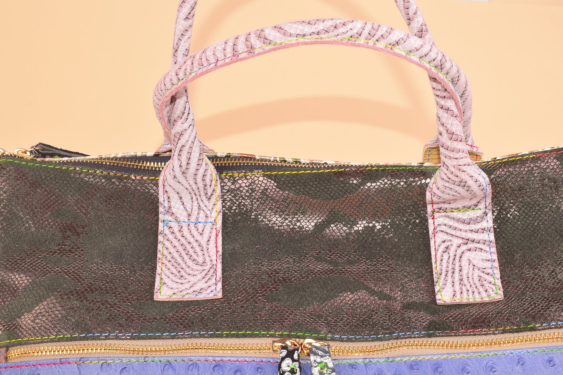 Scopri il Maxi Borsone "Digital Pause", un mix di stile e praticità con la sua pelle patchwork unica. Dotato di una tracolla regolabile e removibile, ti accompagna ovunque con comfort. Le due tasche esterne con zip ti permettono di tenere tutto a portata di mano, perfetto per i tuoi spostamenti con un tocco giocoso.